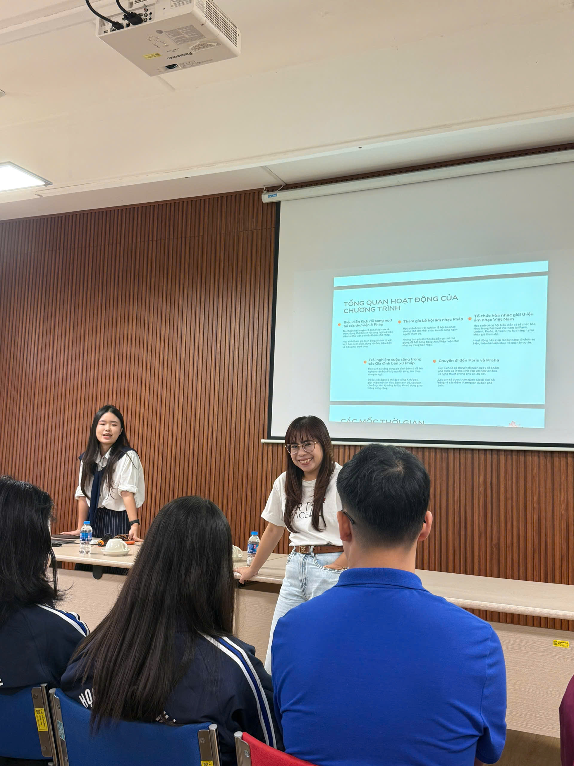 Với phong thái gần gũi và truyền cảm hứng, cô Trang đã mang đến cho sinh viên một buổi chia sẻ vô cùng bổ ích xoay quanh vai trò của công nghiệp sáng tạo trong việc quảng bá hình ảnh quốc gia và giao lưu văn hóa quốc tế. Không chỉ dừng lại ở lý thuyết, cô còn chia sẻ nhiều trải nghiệm thực tế trong lĩnh vực truyền thông và nghệ thuật tại Pháp, giúp người nghe hiểu rõ hơn cách mà mỗi cá nhân, đặc biệt là thế hệ trẻ, có thể tham gia vào dòng chảy văn hóa toàn cầu thông qua những dự án sáng tạo.
