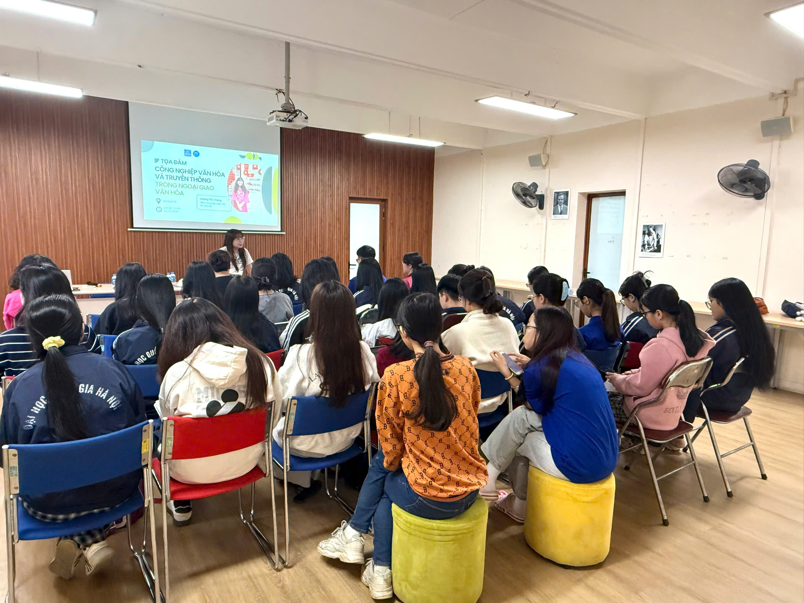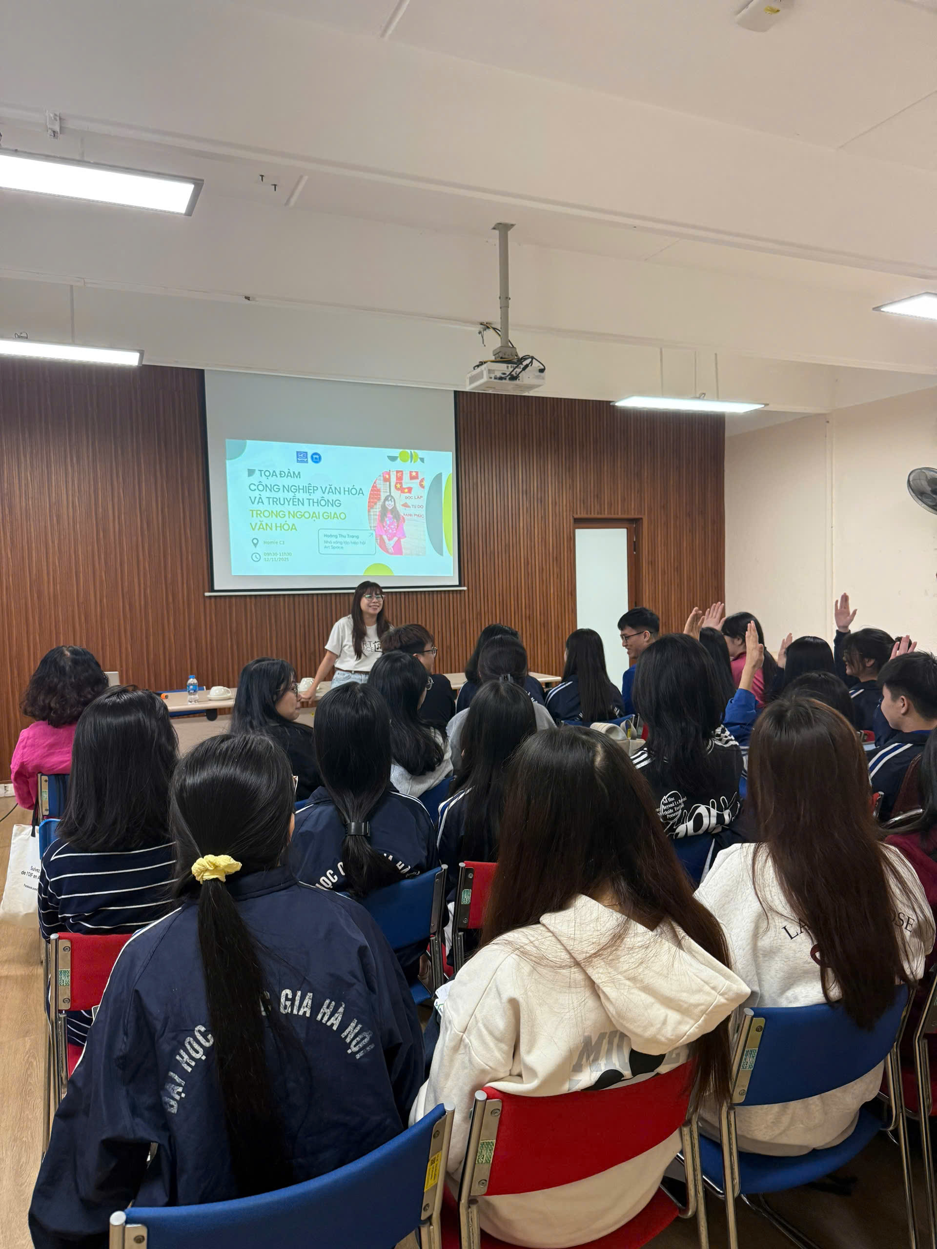 Không khí buổi tọa đàm trở nên sôi nổi khi các bạn sinh viên hào hứng đặt câu hỏi, chia sẻ suy nghĩ của mình về mối liên hệ giữa ngôn ngữ, truyền thông và sức mạnh mềm của văn hóa. Đây cũng là dịp để các bạn mở rộng góc nhìn, nhận ra rằng ngoại giao văn hóa không chỉ là công việc của chính phủ, mà còn được tạo dựng từ những ý tưởng sáng tạo, tinh thần cởi mở và năng lực kết nối của từng con người.