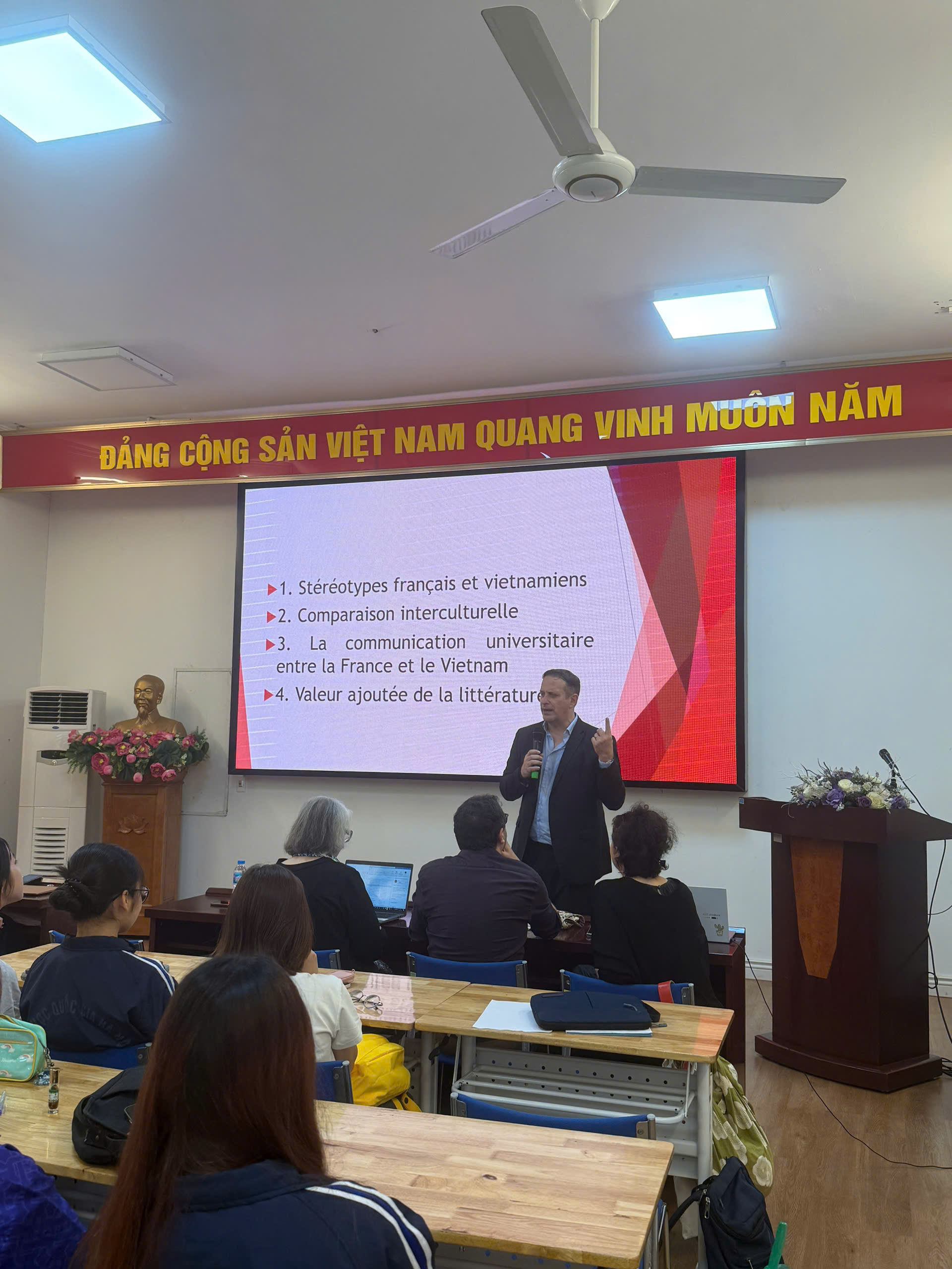 Diễn giả của chương trình là Tiến sỹ Manuel Jobert, Phó Hiệu trưởng kiêm Giám đốc Viện Quốc tế Pháp ngữ – Trường Đại học Lyon 3, CH Pháp. Trong gần hai giờ, ông đã chia sẻ những góc nhìn sâu sắc về khuôn mẫu văn hóa Pháp – Việt, giao tiếp liên văn hóa, trao đổi học thuật giữa hai quốc gia và vai trò của văn học trong việc xây dựng bản sắc văn hóa.