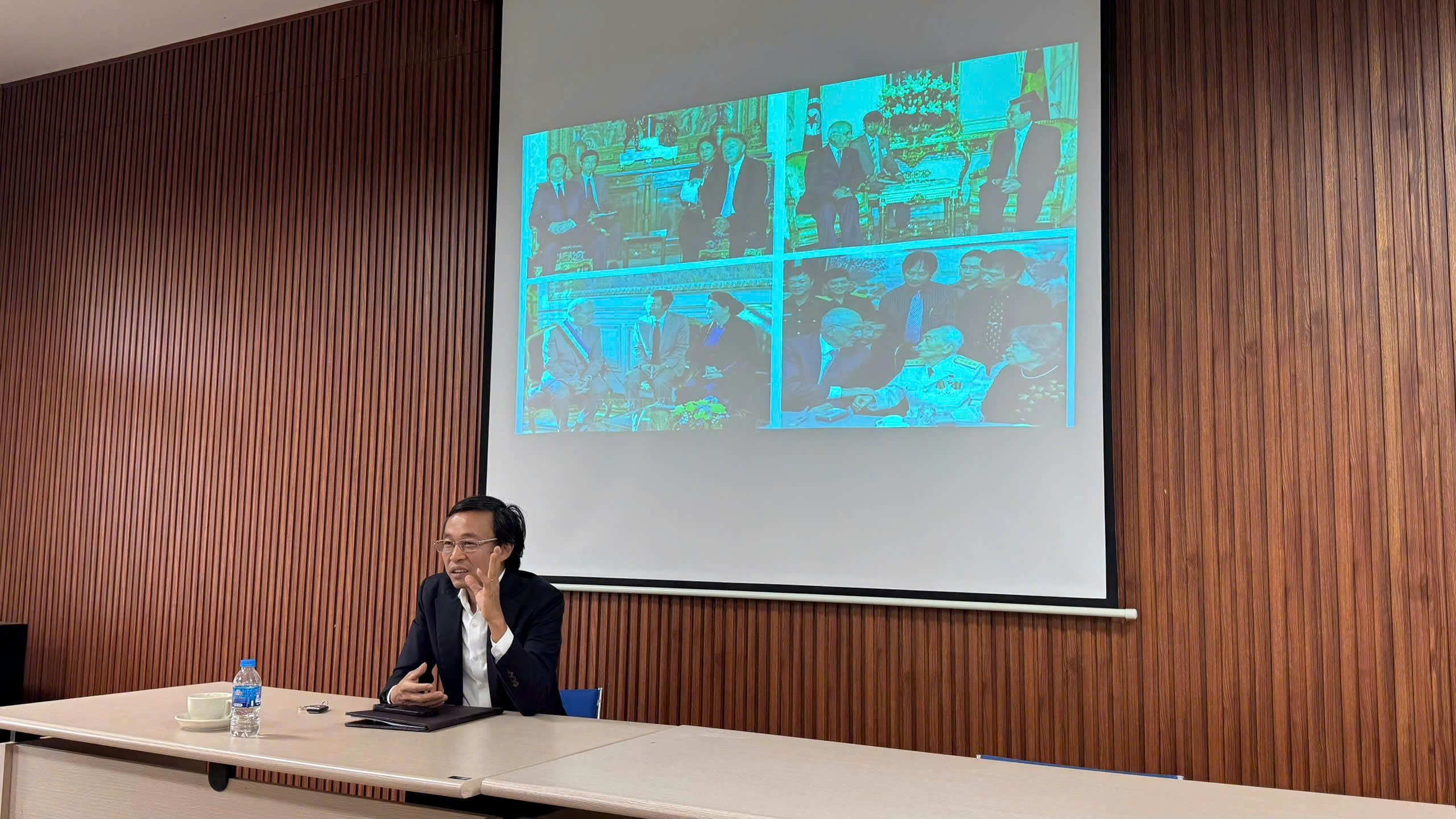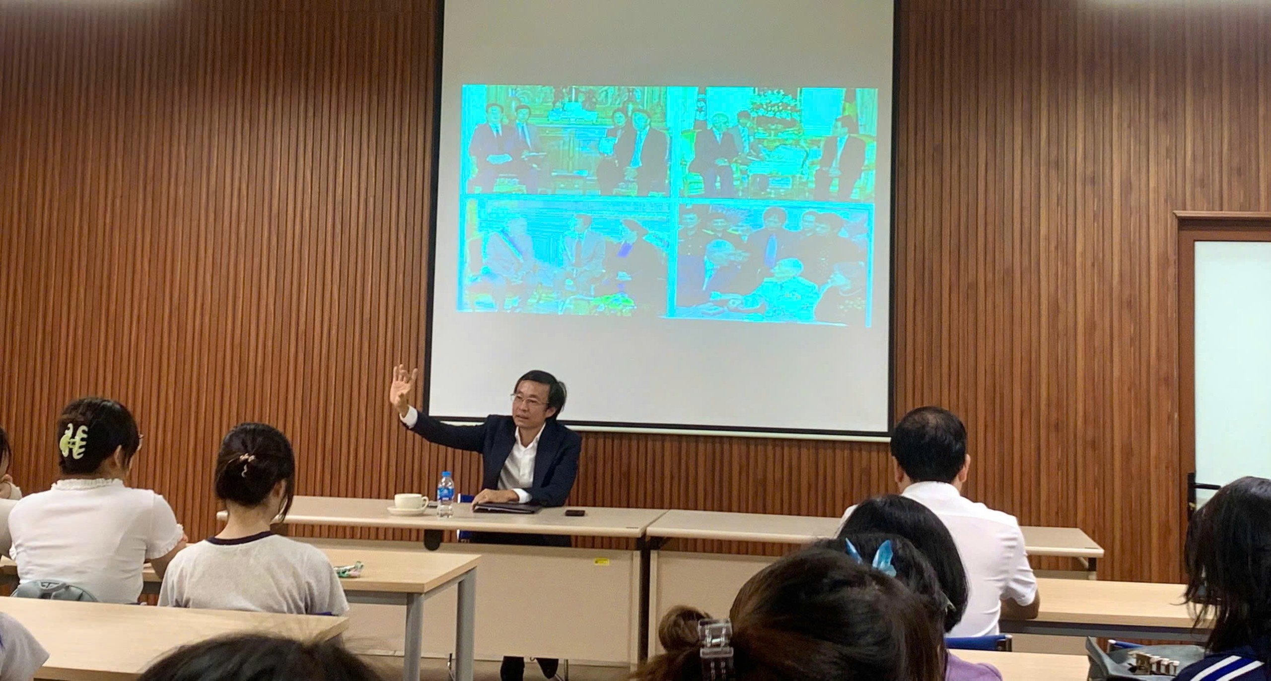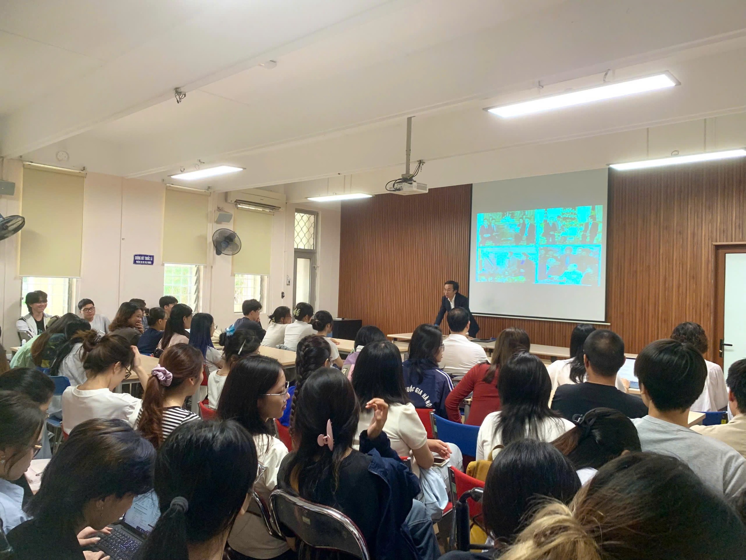 Diễn giả Trần Quang Hiếu – Cựu Phiên dịch viên cao cấp tiếng Pháp – Vụ Biên Phiên dịch quốc gia, Bộ Ngoại giao Việt Nam, nhà sáng lập công ty du lịch Amica Travel, đã có một buổi chia sẻ sâu sắc về thực tiễn làm nghề cũng như giải đáp những thắc mắc của các bạn sinh viên xoay quanh định hướng này.