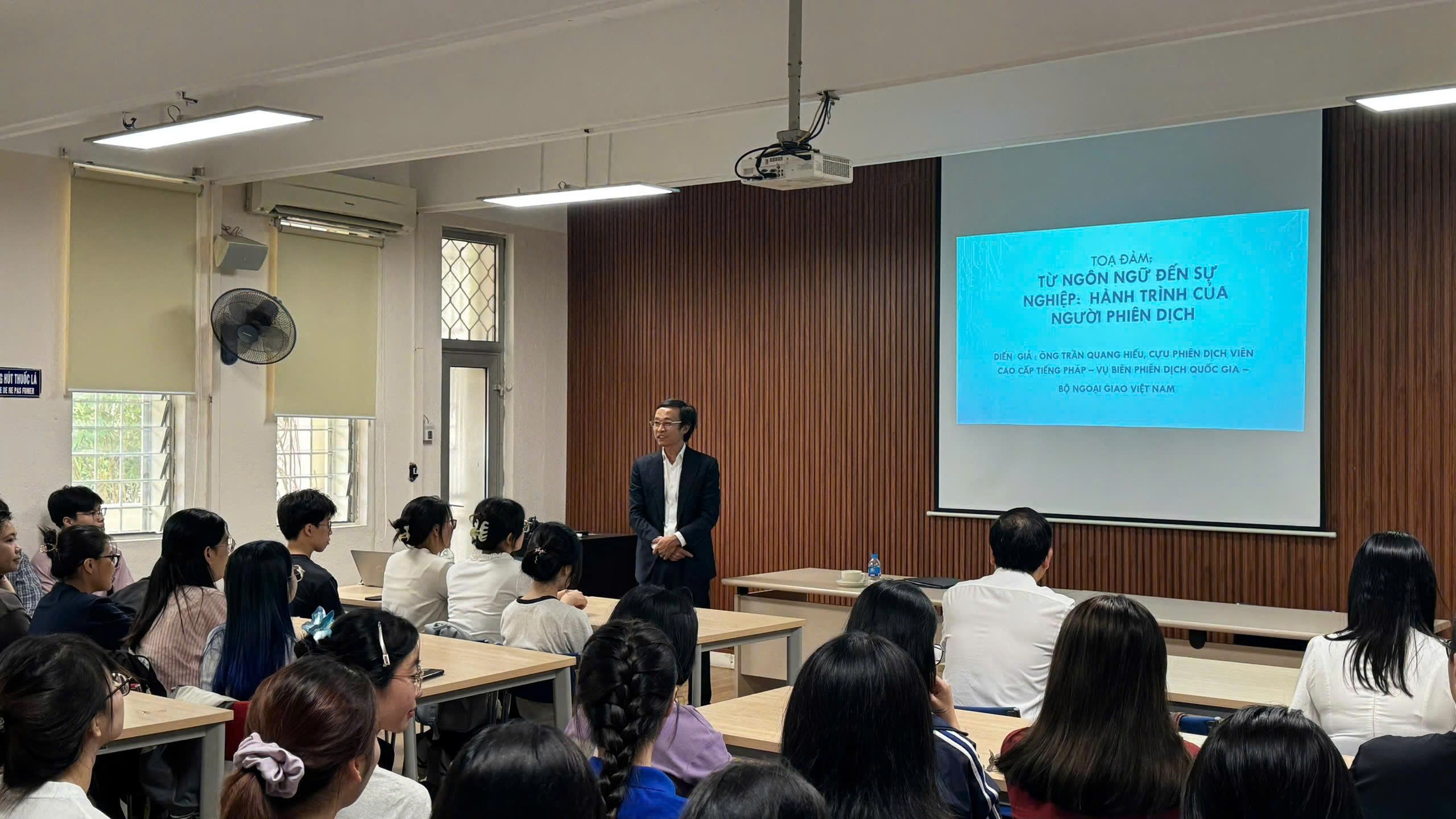 Ngày 13/10/2025, các bạn sinh viên năm 3 và năm 4 định hướng Biên Phiên dịch Khoa Ngôn ngữ và Văn hoá Pháp đã có cơ hội tham gia buổi toạ đàm với chủ đề: “Từ ngôn ngữ đến sự nghiệp: Hành trình của người phiên dịch”.